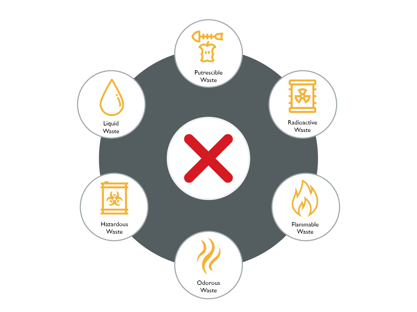 We do not accept Asbestos, Liquid/ Food/ Radioactive or Medical waste, and Flammable or hazardous materials.